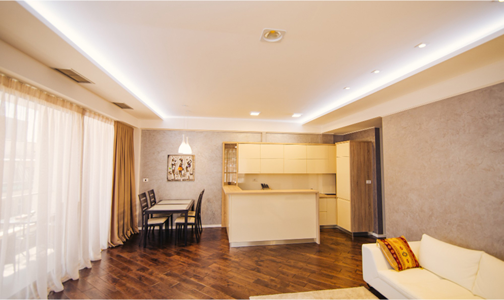 Iebūvētie gaismekļi ir risinājums, kad viss paslēpts griestos. Gaisma šķiet kā plūstoša no nekurienes, radot tīrības sajūtu, izceļot telpas ģeometriju un nepievēršot uzmanību pašiem gaismas avotiem.